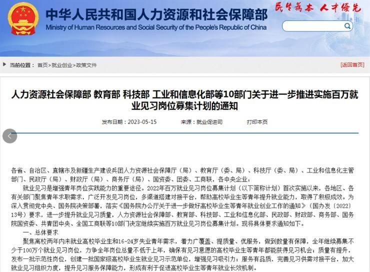 就业见习是增强青年岗位实践能力的重要途径。2022年百万就业见习岗位募集计划(以下简称计划)首次实施以来,各地区、各有关部门聚焦青年求职需求,广泛开发见习岗位,多渠道搭建对接平台,帮助高校毕业生等青年提升就业能力,取得了积极成效。为深入贯彻党中央、国务院决策部署,落实《国务院办公厅关于进一步做好高校毕业生等青年就业创业工作的通知》(国办发〔2022〕13号)要求,进一步提升就业见习质量,人力资源社会保障部、教育部、科技部、工业和信息化部、民政部、财政部、商务部、国务院国资委、共青团中央、全国工商联等10部门决定继续实施百万就业见习岗位募集计划。现将具体要求通知如下。