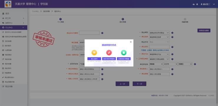 第二步:企业完善信息并提交后,学生在后台查看已更新用人单位信息的签约。确认无误点击【确认签约】提交审核。