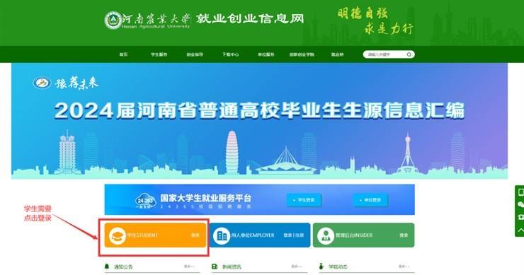 第一步:毕业生打开就业信息网( http://henau.goworkla.cn/)从学生端口登陆管理中心,登录方法:首次登录的用户,使用手机微信扫码登录,根据提示授权微信登录、绑定手机号,完善头像、姓名、性别、出生日期、籍贯等信息;