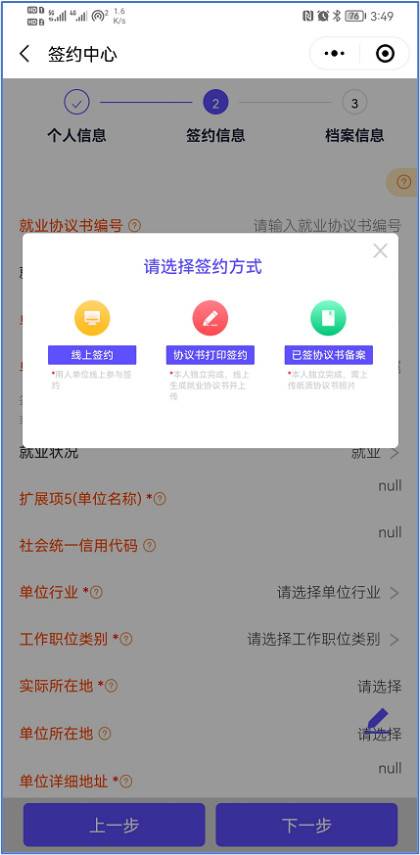 第四步:完善【签约信息】,当就业类别选择【签就业协议签约】或签【劳动合同签约】时需进一步选择签约方式(以下着重讲解此两种就业类别);当选择剩余就业类别时,按步骤将信息填写完毕即可,无需选择签约方式。