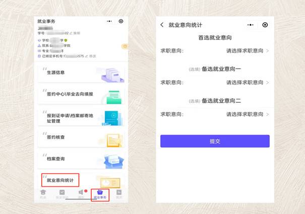 第一步:点击底部“就业事务”查看自己学号、院系、专业、绑定手机号是否正确,如学号、手机号绑定异常,点击后边的“修改/换绑”进行信息更正;如果信息正确,选择“就业意向统计”根据个人真实意向填报;